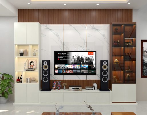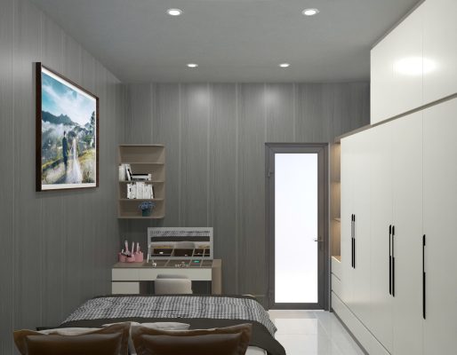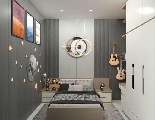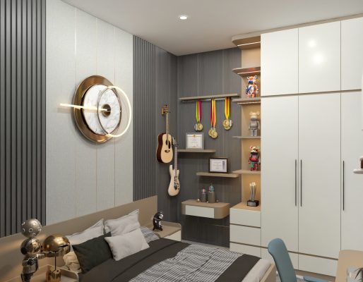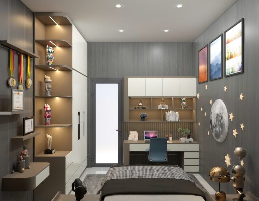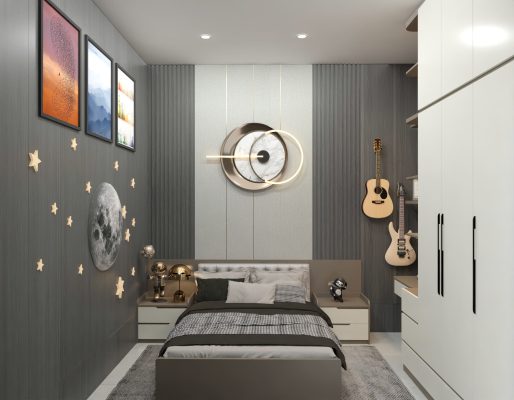 Bố trí và ốp phòng ngũ con trai. Ốp lam sóng, nano, vân vải, tủ áo, giường…