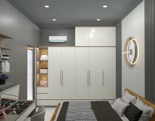 Bố trí và ốp phòng master. Ốp lam sóng, nano, vân vải, tủ áo, giường…